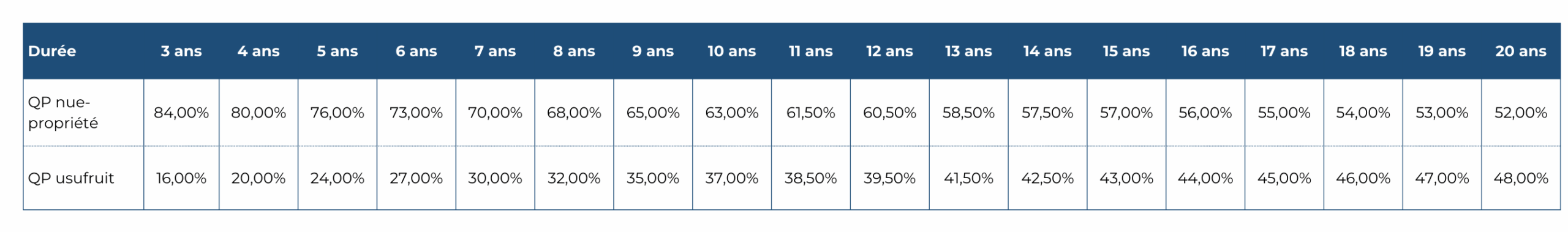 La clé de démembrement détermine la répartition de la valeur des parts de SCPI entre nue-propriété et usufruit selon la durée du démembrement. Plus la durée est longue, plus la part de valeur attribuée à l’usufruit augmente, tandis que la nue-propriété bénéficie d’un prix d’acquisition décoté.